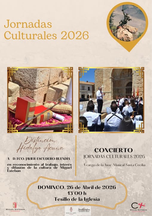 El Ayuntamiento de Miguel Esteban acoge este domingo, 26 de abril, dos de los actos centrales de sus Jornadas Culturales 2026. A partir de las 13:00 h, el Tesillo de la Iglesia será el escenario de la entrega de la distinción "Hidalgo Acuña" a D. Francisco Javier Escudero Buendía y del concierto extraordinario de la Asociación Musical Santa Cecilia.