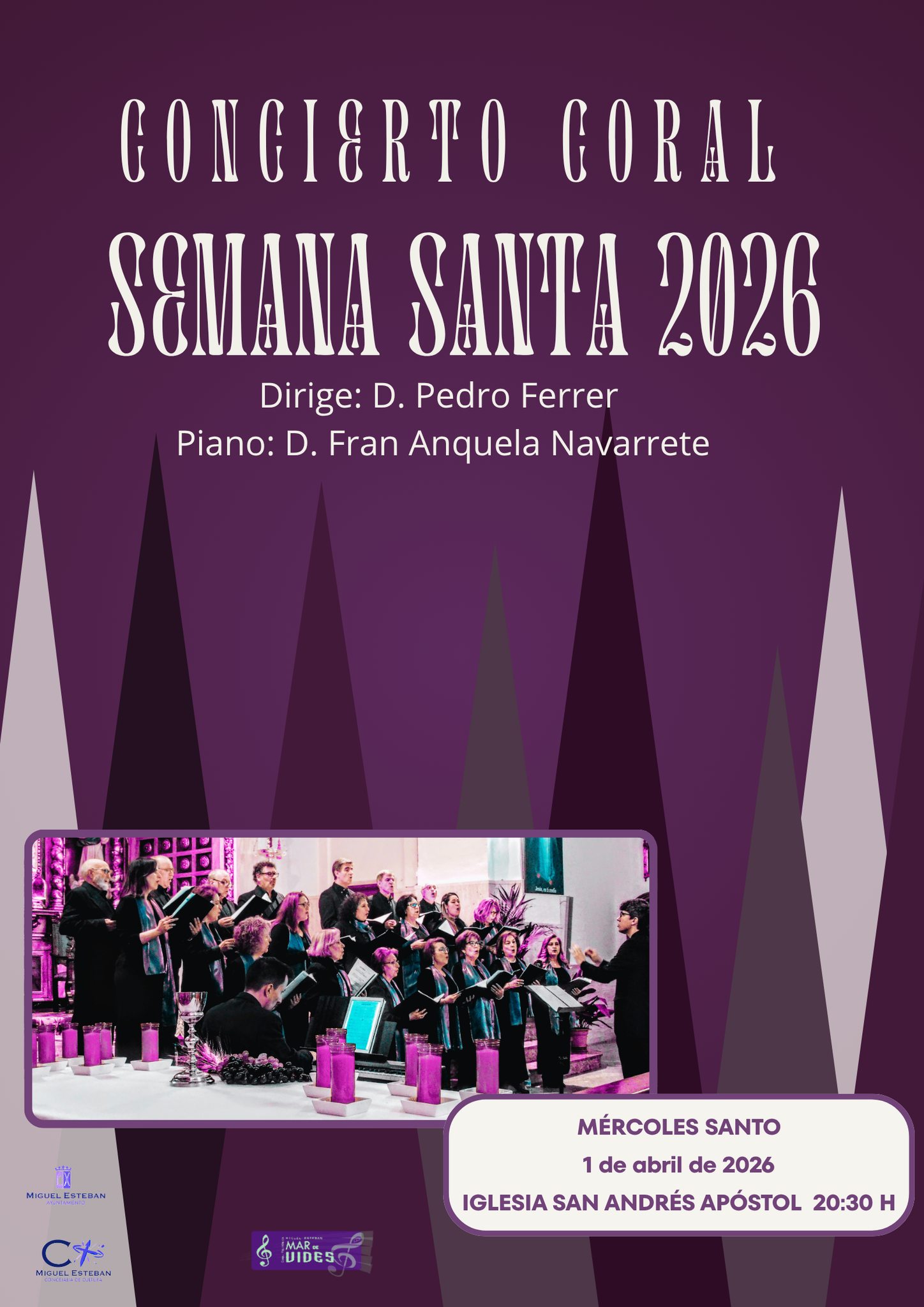 Por su parte, el miércoles 1 de abril será el turno del concierto coral de Semana Santa, que se celebrará a las 20:30 horas en la Iglesia Parroquial San Andrés Apóstol. La Coral Polifónica Mar de Vides, dirigida por D. Pedro Ferrer y con acompañamiento al piano de D. Fran Anquela Navarrete, ofrecerá un programa centrado en la música sacra, en un entorno especialmente significativo que potenciará la experiencia musical y espiritual del evento.