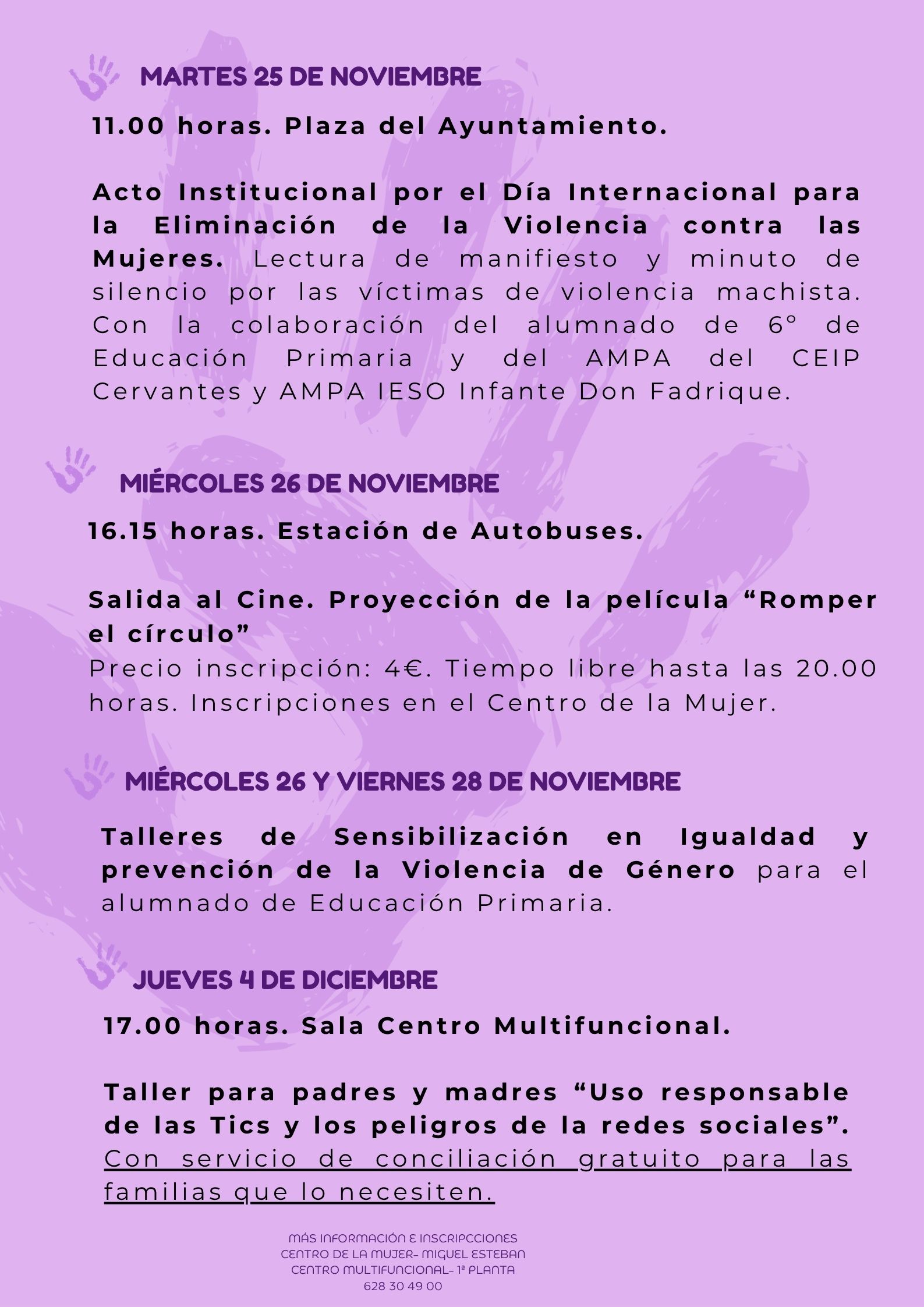 En este sentido, ha destacado que este año el acto institucional contará con la participación del alumnado de 6º de Educación Primaria y de las AMPAS del CEIP Cervantes y del IESO Infante Don Fadrique, quienes colaborarán en la lectura del manifiesto y en el minuto de silencio en memoria de las víctimas. “Queremos que la ciudadanía, y especialmente los más jóvenes, formen parte activa de este compromiso colectivo”, ha remarcado la concejala, animando a migueletes y migueletas a sumarse a todas las actividades programadas porque “la erradicación de la violencia hacia las mujeres es tarea de todos y todas”.